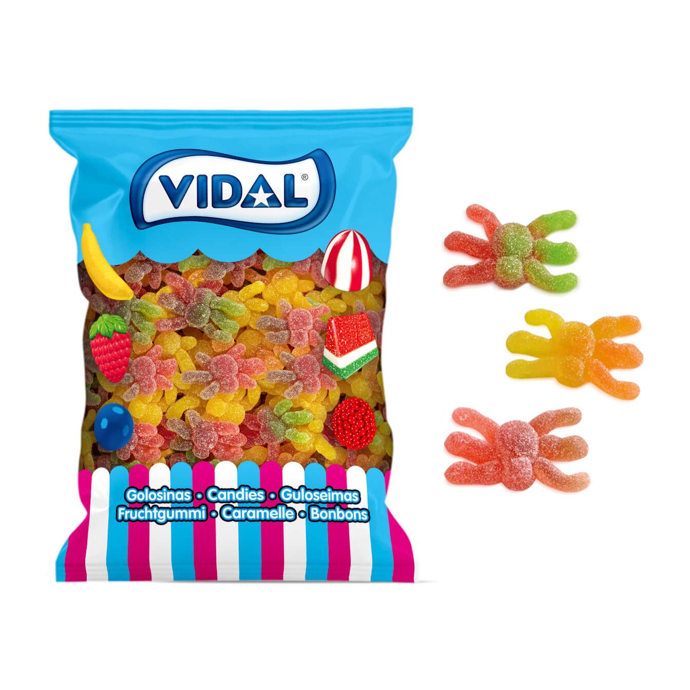 Chucherías en forma de araña con una divertida cobertura de azúcar y diferentes sabores a: limón, cola, fresa y naranja. Se convertirá en la chuche favorita para tus fiestas más terroríficas. Chuche creación de Vidal Golosinas.