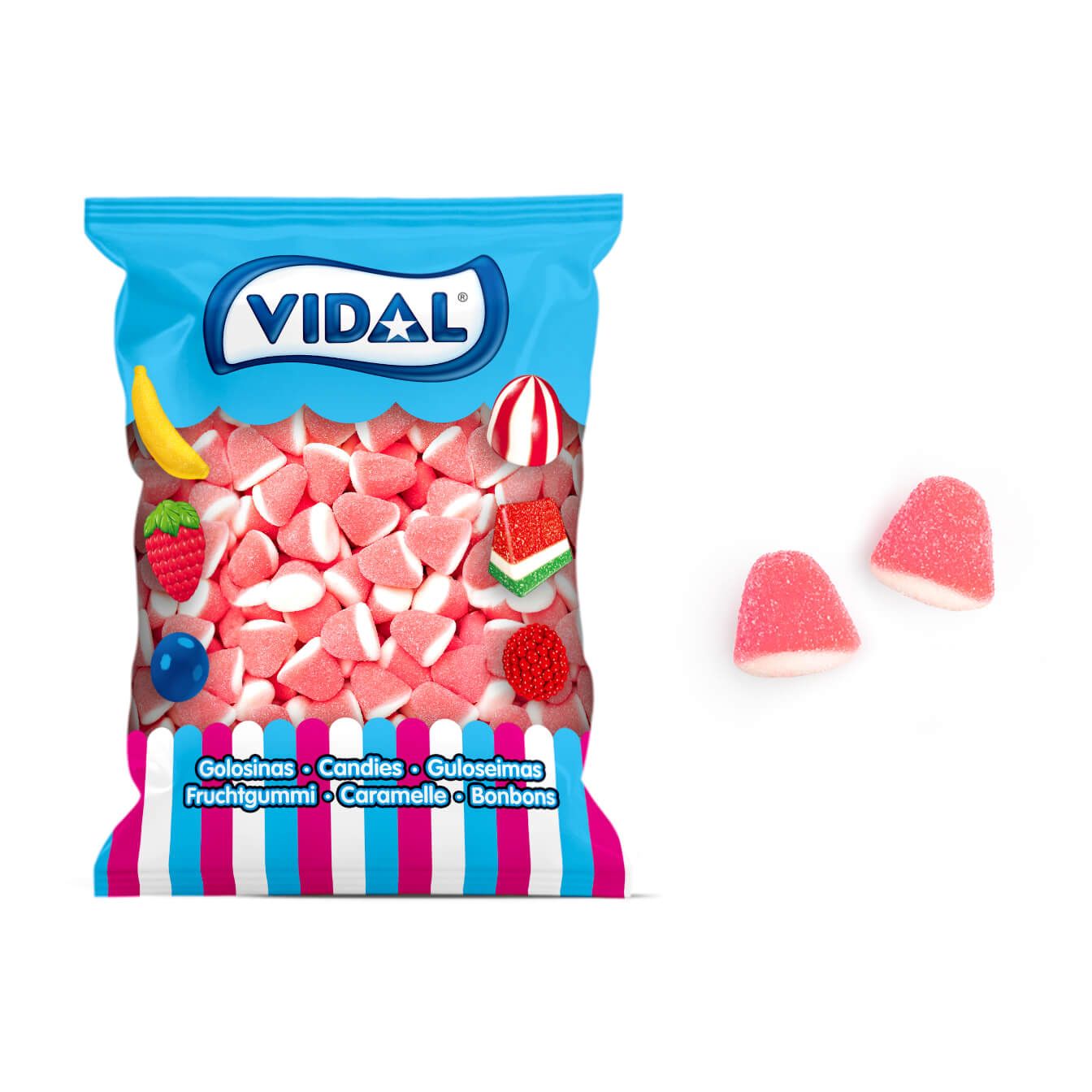 Caramelos de goma en forma de besitos con una deliciosa combinación de sabor fresa y nata con cobertura de azúcar. Chuche original de Vidal Golosinas ideal para disfrutar de un solo bocado.