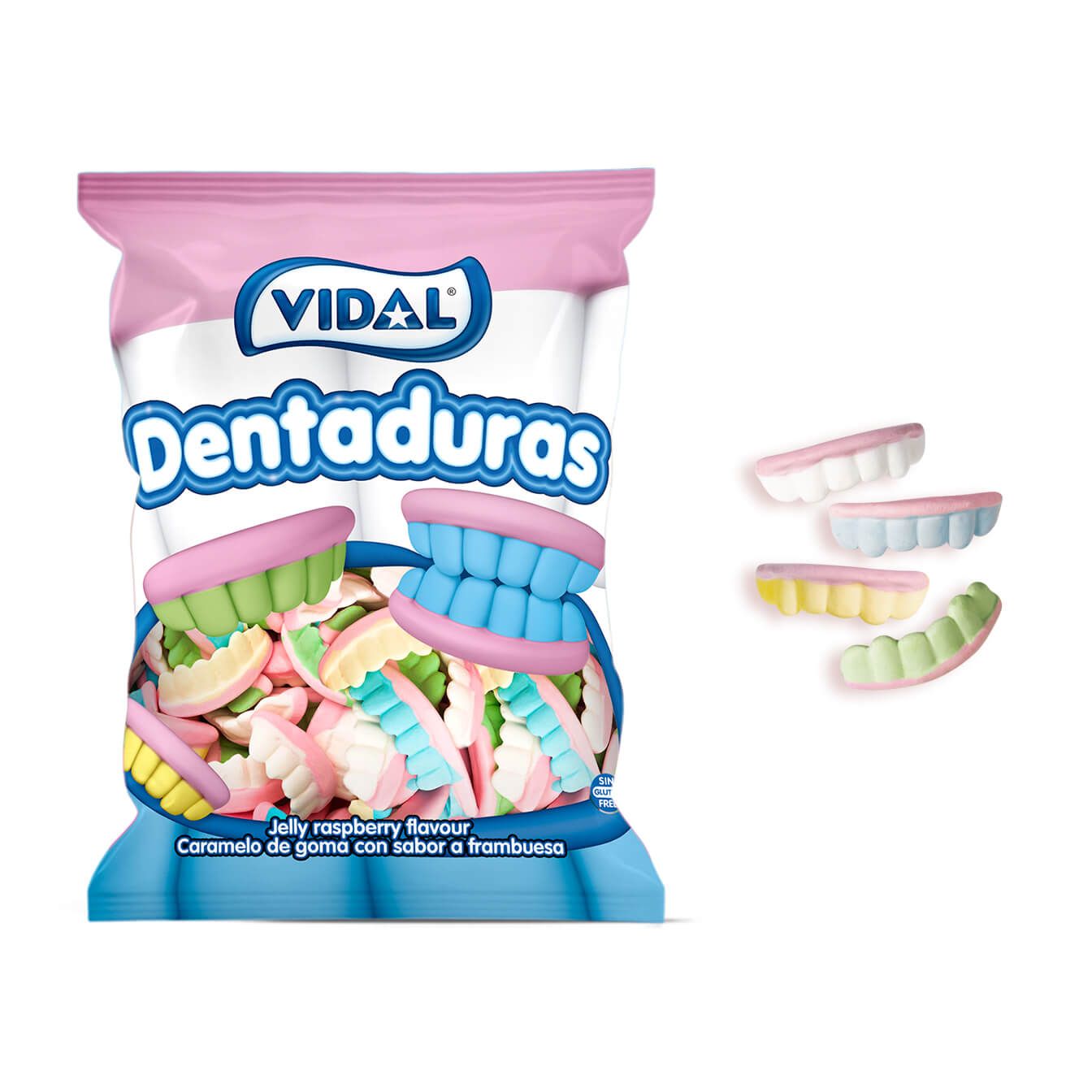Chuche en forma de dentadura con una increíble textura blandita y suave, y un intenso sabor a frambuesa irresistible. Además la encontrarás en diferentes y divertidos colores como: rosa, azul, amarillo, verde y blanco. Disfruta de esta golosina clásica en cualquier lugar y momento. Las dentaduras son originales de Vidal Golosinas