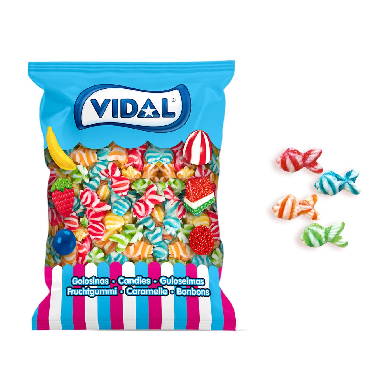Divertidas golosinas en forma de peces con un autentico sabor dulce a fresa y originales colores: azul, verde, rojo y amarillo en combinación con el blanco. Disfruta de esta creación original de Vidal Golosinas en tus fiestas temáticas o días especiales.