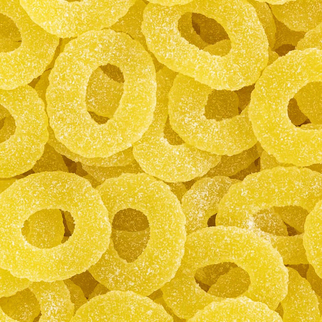 Golosina en forma de rodaja de piña con una dulce cobertura de azúcar y un natural sabor a piña. Ideal para los amantes del sabor a piña Te aseguramos que su intenso sabor, no te dejará indiferente.